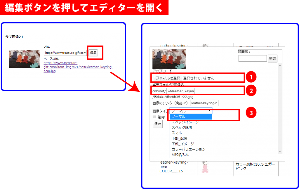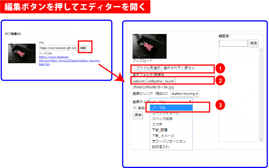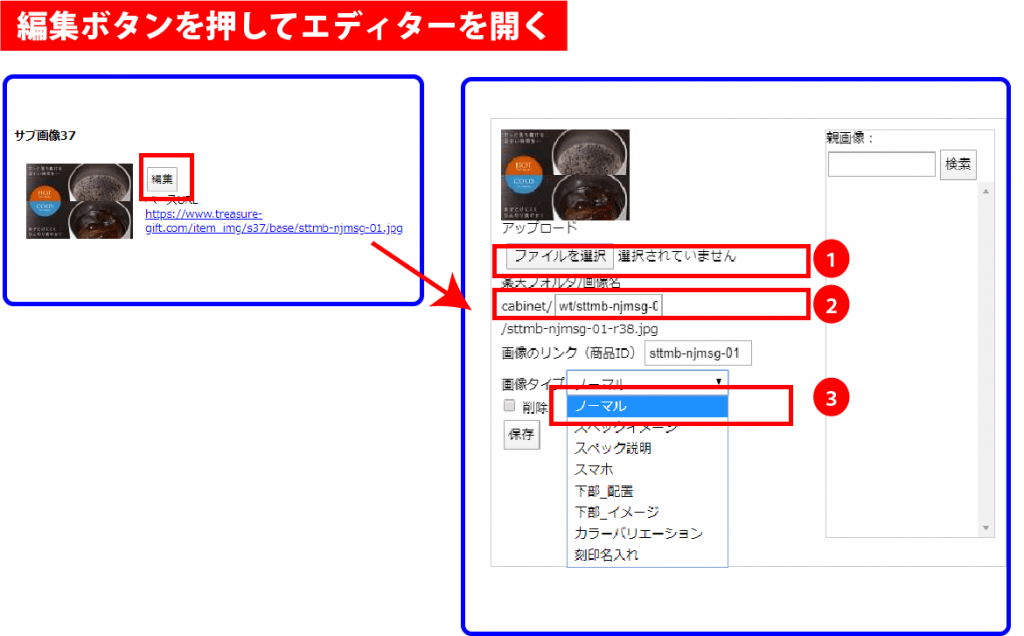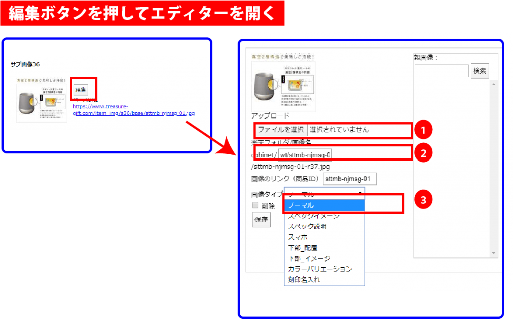 本店の商品詳細ページでは、最初に表示される商品画像となります。 - 登録場所